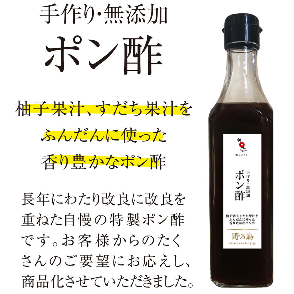 【野乃鳥のポン酢】 醤油、酢、みりん、酒、すだち果汁、柚子果汁、椎茸、昆布、鰹節(一部に大豆、小麦を含む) |