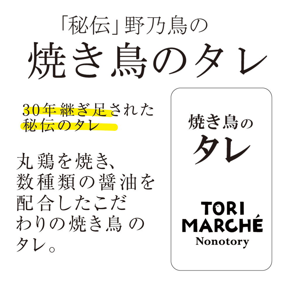 【野乃鳥の焼き鳥のタレ】 醤油、酒、ザラメ、みりん、鶏肉(国産)、白ワイン、紹興酒、砂糖、赤ワイン、干し椎茸、昆布(一部に大豆、小麦を含む) |
