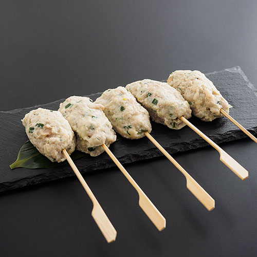 【野乃鳥の特製つくね】 鶏肉(国内産)、玉ねぎ、豆腐、卵白、パン粉、白ネギ、ニラ、つくねペースト、にんにく、生姜、セロリ、食塩、大葉/(一部に卵・小麦・大豆・えび・鶏肉) |